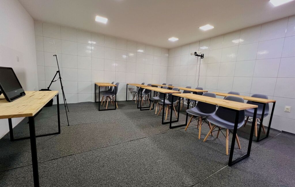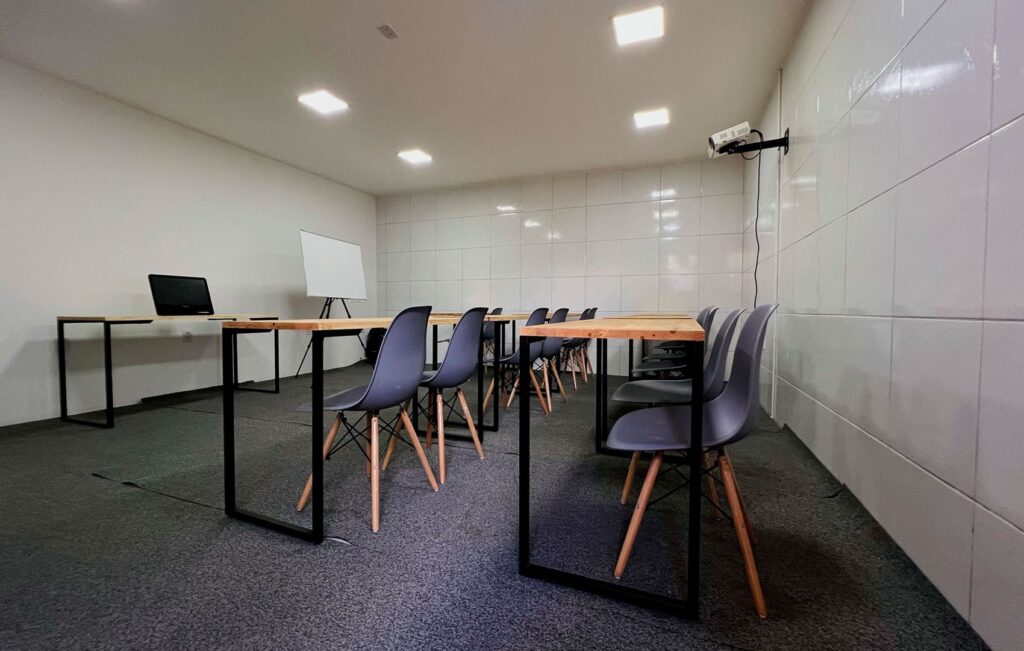 Sala de aula com 25 m² e capacidade para 18 alunos, totalmente equipada com ar condicionado, audiovisual, bebedouro e espaço para coffee break e banheiro de apoio na área externa. Ideal para capacitações de qualquer área.